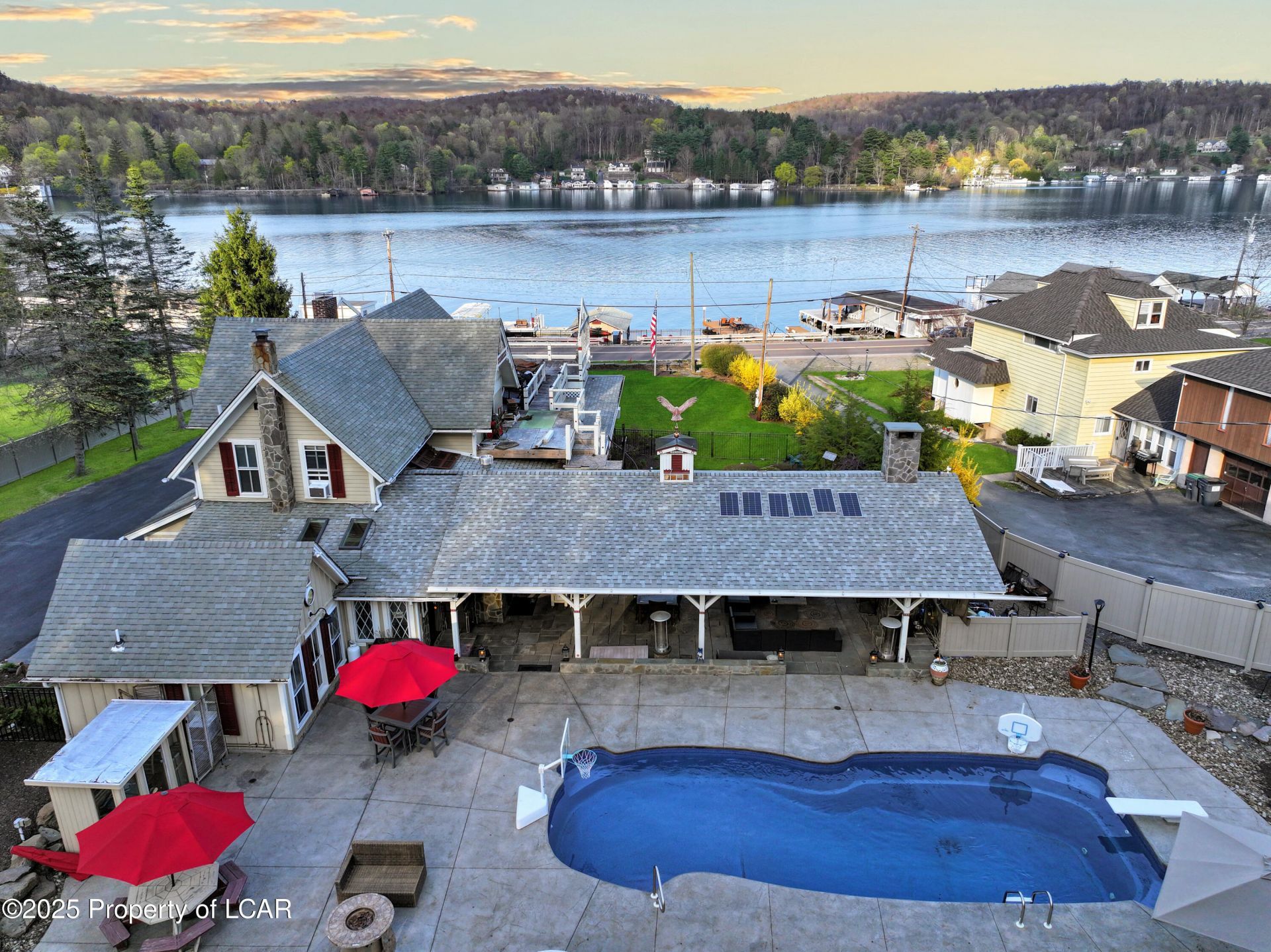 RELAX AT YOUR STUNNING LAKEFRONT ON HARVEYS LAKE! PENNSYLVANIA'S LARGEST NATURAL LAKE! SWIMMING POOL & BACKYARD OASIS! 13+ ACRES! 145 OF WATERFRONT. This rare and iconic lakefront features 4 bedrooms and 3 bathrooms, including a spacious primary suite with a fireplace and private rooftop terrace. A chef's kitchen offers custom cabinetry, premium appliances, and a wood-burning stove... while the sunroom and heated/cooled porch provide stunning lake views year-round. The home also includes a private office with an attached full bath, original hardwood floors, mahogany doors, hand-laid slate and marble finishes, radiant heated floors, updated electrical and plumbing, Restoration Hardware vanities, and Tiffany lighting throughout. Outdoor amenities include a heated saltwater fiberglass pool with lighting, a spa-quality hot tub, a tranquil koi pond, and an outdoor kitchen beneath a custom pergola and slate patio, complete with a stone wood-burning fireplace. The grounds feature landscaped gardens, open lawns, walking trails, a basketball court, and several historic outbuildings, including a 1892 stone barn, a 2-car garage/workshop with wood stove, an RV building, a restored well house, and multiple storage sheds. A fully fenced pool area and stone perimeter walls ensure both privacy and charm. Lakefront features include a private dock, a 3-slip boathouse, and a permit-ready site for future lakefront development, supported by a completed aquatic study. Modern infrastructure upgrades include new windows set in original frames, closed-cell foam insulation, a 3-phase electric system, a newer septic system, water filtration, sprinkler systems, a gravity-fed well, multiple fireplaces, a sauna, and a walkable attic with storage. Zoned Agricultural-Residential with no HOA! ENJOY PONTOON CRUISING, WAKEBOARDING, KAYAKING, AND JUST ANCHORING UP WITH FRIENDS! A potential guest house is also an added option! Just 2.5 hours to NYC and roughly 2 hours from Philadelphia!